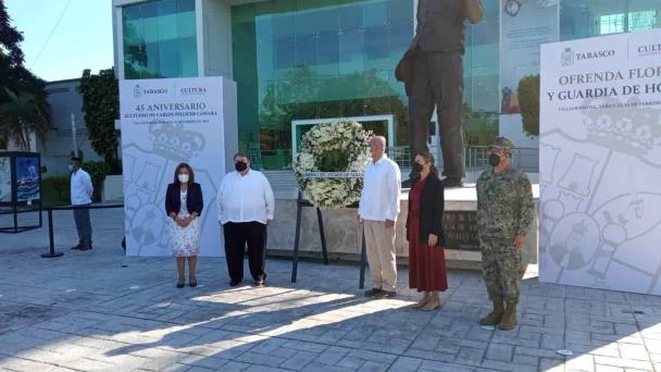 Autoridades de Tabasco realizaron este miércoles una ceremonia de ofrenda floral y guardia de honor por el 45 aniversario luctuoso de Carlos Pellicer Cámara.