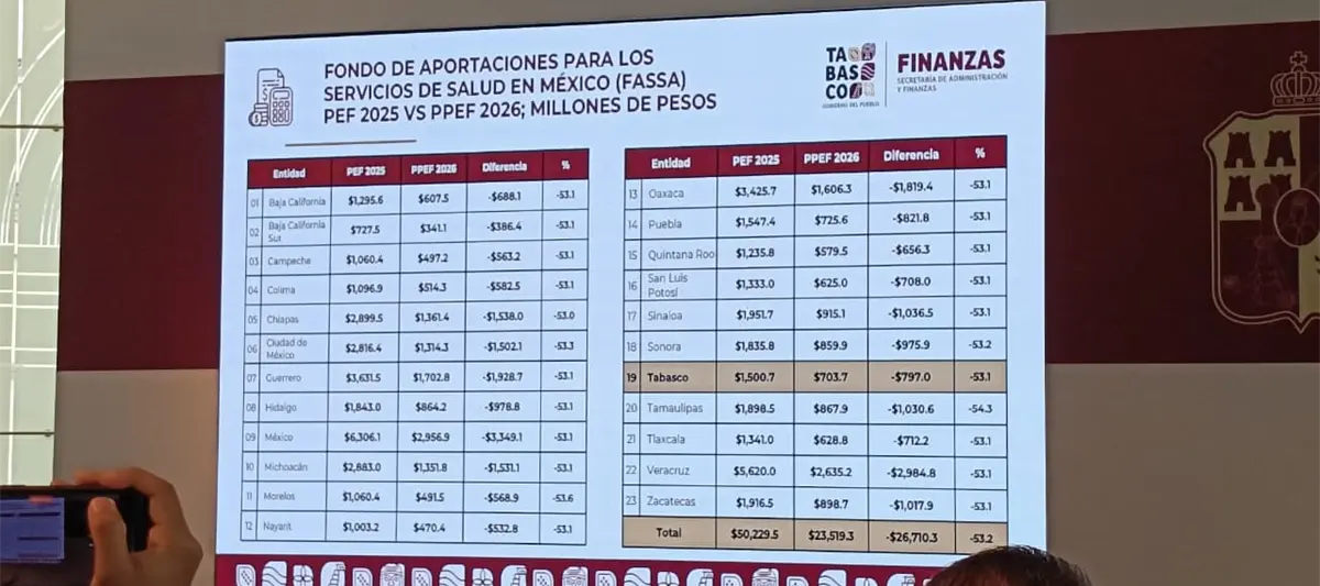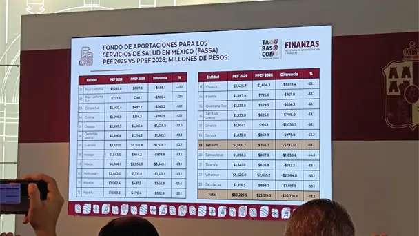 En 2026, Tabasco y 22 entidades más tendrán una reorientación de recursos del Fondo de Aportaciones para los Servicios de Salud en México (FASSA), reportó la Secretaría de Administración y Finanzas.