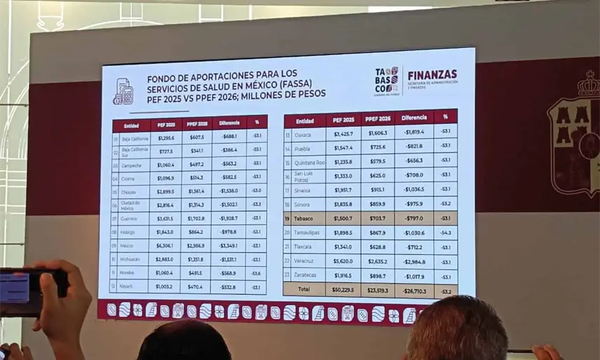 En la conferencia de prensa del gobernador Javier May, el encargado del despacho de esta dependencia, Adrián Magaña Martínez, mostró una gráfica donde se explica que en el PEF 2026 a la entidad le asignaron 703 millones de pesos, cuando este año fue de mil 500 millones de pesos.