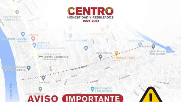 El Ayuntamiento de Centro informó que a partir de este viernes 1 de julio se reduce a un carril la calle Primera del Monal, de la Colonia Gaviotas Sur.