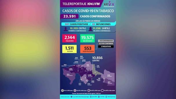Tabasco registró 307 nuevos casos y 33 defunciones por COVID-19 en las últimas 24 horas, por lo que el acumulado de contagios asciende a 23 mil 591 y de fallecimientos a 2 mil 144, informó la Secretaría de Salud del estado.