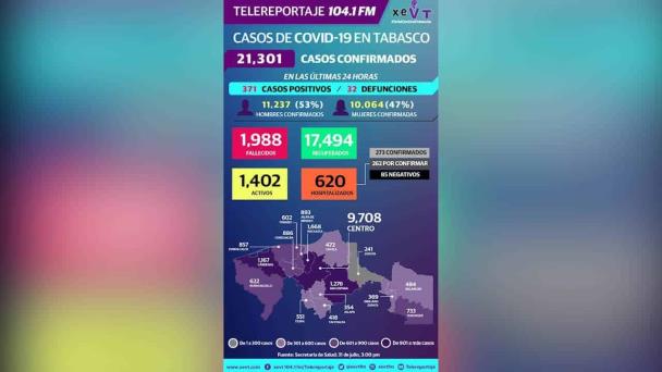Tabasco sumó en las últimas 24 horas 371 nuevos casos positivos de Coronavirus y 32 defunciones, con esta cifra llega a un acumulado de 21 mil 301 contagios y mil 988 decesos.