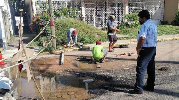 Repara ayuntamiento fuga en calle Libertad en Tamulté; concluirán trabajos antes de cinco días