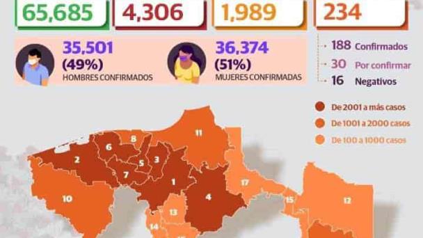 En su reporte técnico, la dependencia local precisó que a la fecha se tienen mil 989 pacientes activos y 234 hospitalizados por padecimiento respiratorio, de los cuales 188 son positivos a coronavirus, 16 negativos y 30 por confirmar.