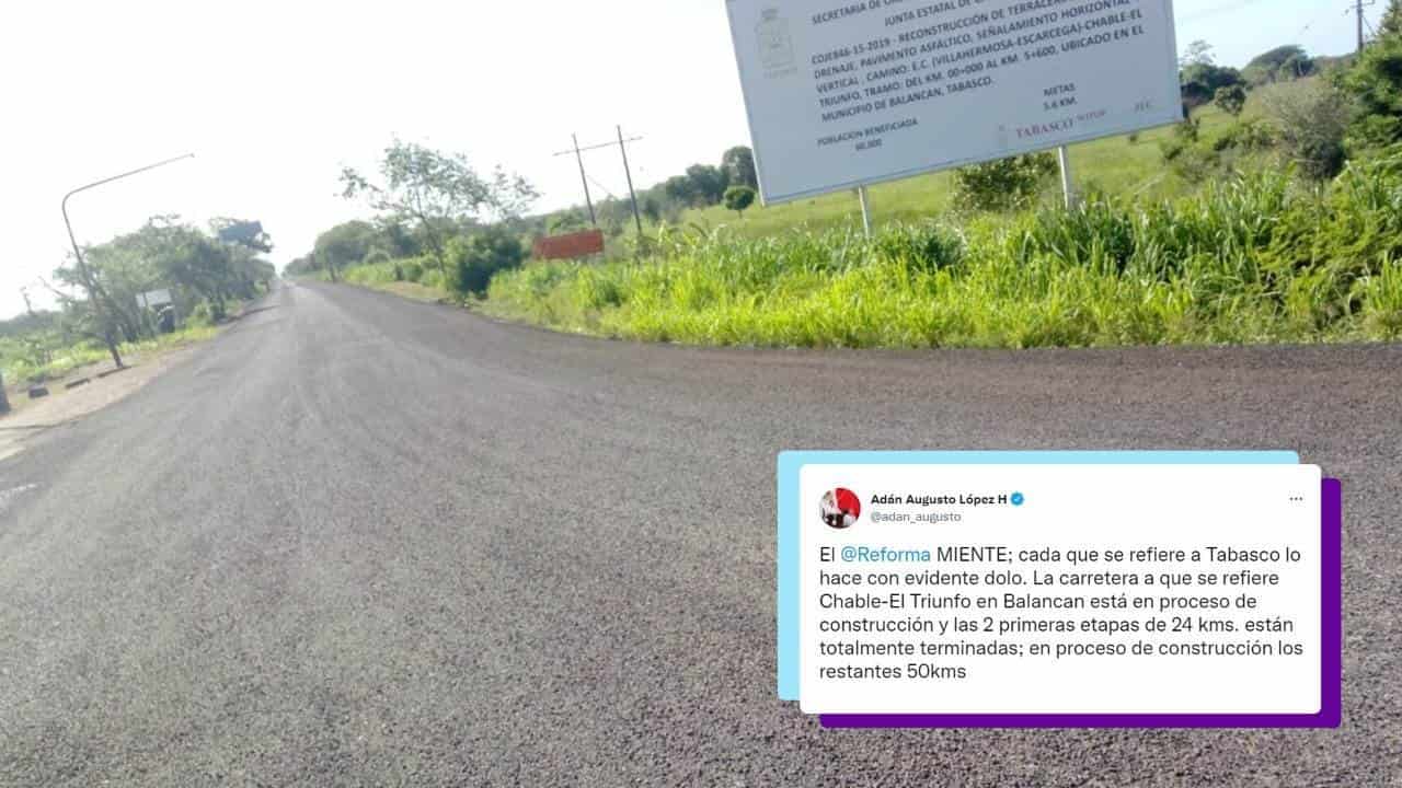 “El Reforma MIENTE; cada que se refiere a Tabasco lo hace con evidente dolo. La carretera a que se refiere, Chablé-El Triunfo en Balancán está en proceso de construcción y las 2 primeras etapas de 24 kms. están totalmente terminadas; en proceso de construcción los restantes 50kms”, escribió en un tuit.