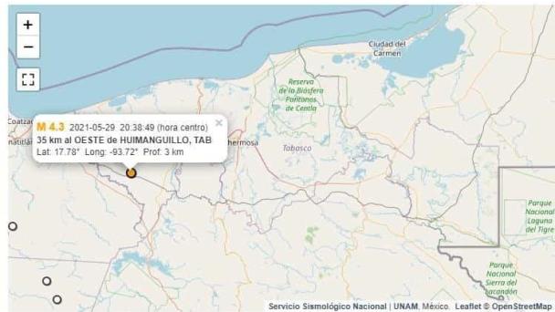 El Servicio Sismológico Nacional (SSN) confirmó que este sábado se registró un sismo de magnitud 4.3, con epicentro a 35 kilómetros al oeste de Huimanguillo.