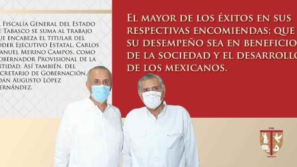 En un comunicado, la Fiscalía deseó el mayor de los éxitos en las respectivas encomiendas que desempeñarán Adán Augusto López Hernández como secretario de Gobernación y Carlos Manuel Merino Campos, como gobernador del Estado.