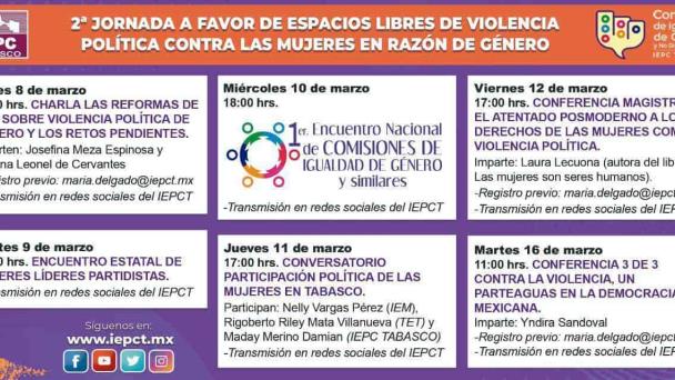 Mientras que el jueves 11 de marzo, llevará a cabo el conversatorio, participación política de las mujeres en Tabasco, en donde intervendrán, la directora del IEM, Nelly del Carmen Vargas Pérez; el presidente del TET, Rigoberto Mata Villanueva y la presidenta del IEPCT, Maday Merino.