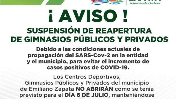 El ayuntamiento de Emiliano Zapata suspendió la autorización para que los gimnasios tanto públicos, como privados, puedan reabrir sus instalaciones a partir del 6 de julio.
