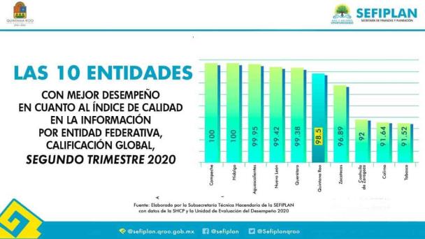 De acuerdo a la evaluación de la Secretaría de Hacienda y Crédito Público sobre el Sistema de Recursos Federales Transferidos, correspondientes al segundo trimestre de 2020, Tabasco se posiciona a nivel nacional en el décimo lugar en cuanto al Índice de la Calidad de la Información (ICI).