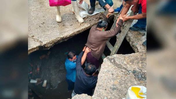 “Iba circulando en Bastar Zozaya, y doblé en Carranza, cuando la señora venía caminando hacia el mercado, y no se percató por la lluvia del hueco, y solita cayó al socavón. Inmediatamente paré el carro, y atrás de ella me aventé a rescatarla. Cayó parada y se fue hasta la cintura de aguas negras. El pasaje que llevaba yo, también se aventó a ayudarla. Ella lloraba para que la sacaran. Mucha gente empezó a apoyar para sacarla”.