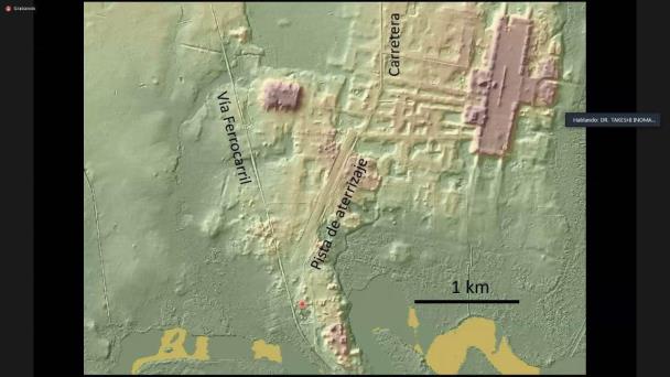 Presentó material gráfico entre fotografías convencionales, las tomadas con el radar Lídar, así como imágenes satelitales en donde se observa que cerca de este recién descubrimiento arqueológico de gran tamaño, se encuentran las vías del Tren Maya.
