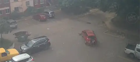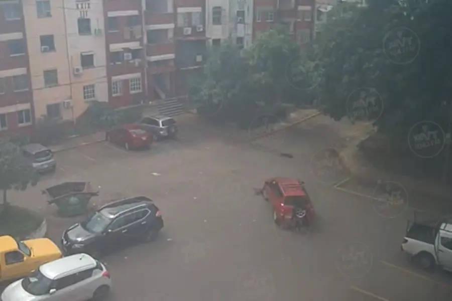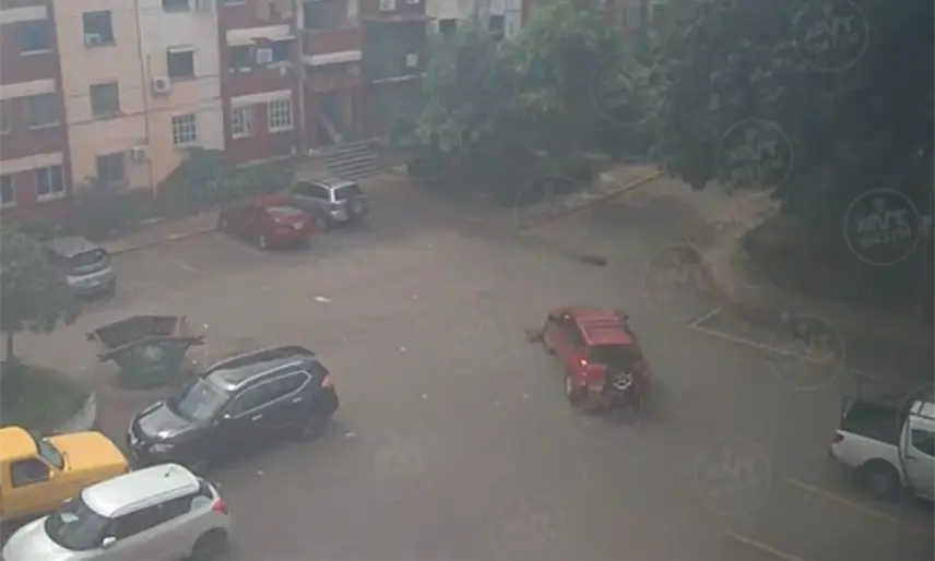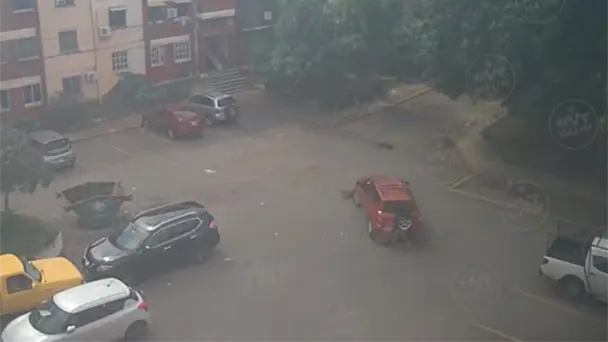 La grabación muestra una camioneta roja ingresar al estacionamiento de la manzana, pasar a un lado del animal y detenerse metros más adelante.