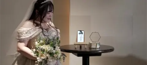 Yurina Noguchi, de 32 años, se vistió de blanco y le dio el ´sí´ en el altar a su prometido, quien la miraba desde la pantalla de un teléfono celular.