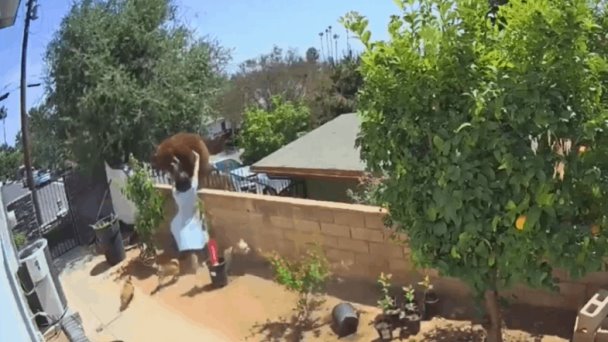 Ante la situación los oseznos huyen, mientras que el oso grande lanza zarpasos en contra de los animales, sin embargo, una mujer sale al patio y corre directamente hacia el mamífero para empujarlo y recoger a sus perros para ponerlos a salvo.