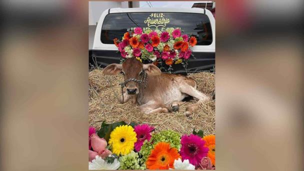 Iraid García García, la joven que fue sorprendida por el inesperado regalo, compartió en su cuenta de Facebook, fotografías del becerro y del momento en que su pareja le entrega en una camioneta el animal que se encuentra cubierto de flores.