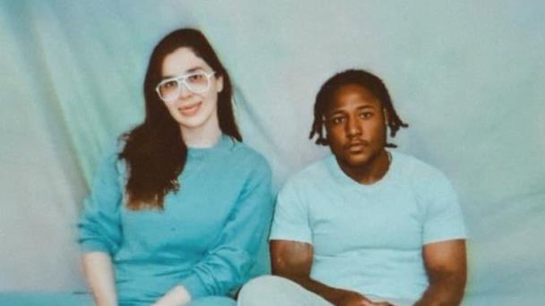 Asimismo, porta lentes, un reloj y tenis, y esta aparece junto a un sujeto afroamericano que porta un pantalón beige y una playera blanca.