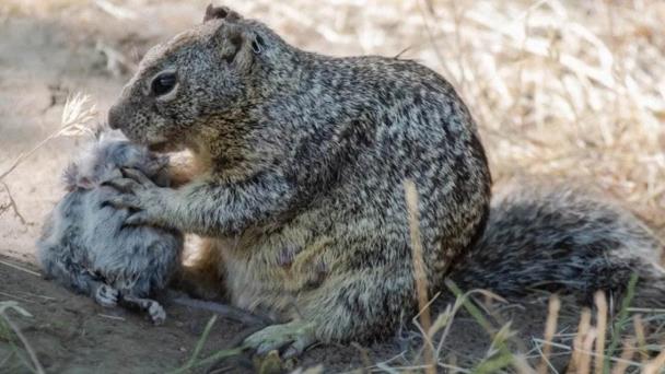 Científicos descubrieron un grupo de ardillas con comportamiento carnívoro cazando y devorando topillos en California, Estados Unidos.