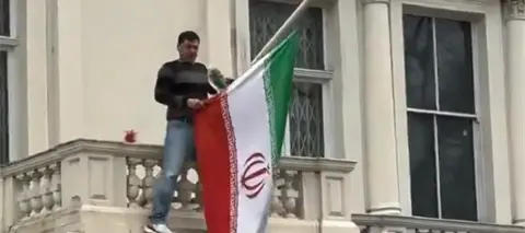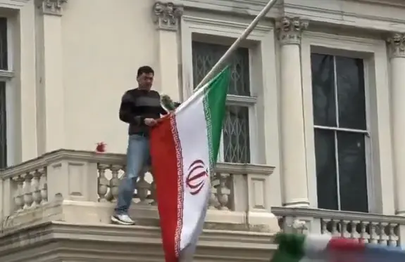 Un video difundido en las redes sociales, muestra a un hombre en el balcón de la misión diplomática, ubicada cerca del Hyde Park londinense, donde aparentemente arranca la bandera oficial de la Revolución Islámica y esgrime otra con el símbolo del león y el sol, que se utilizaba hasta el derrocamiento de la dinastía real de los Pahlaví en 1979.