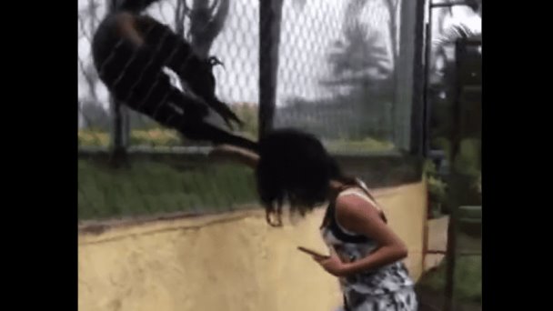 En un primer momento, las personas que acompañan a la mujer se ríen de la situación, pero segundos más tarde, al ver que el mono araña no la soltaba, comienzan a asustar al primate, hasta que la libera.
