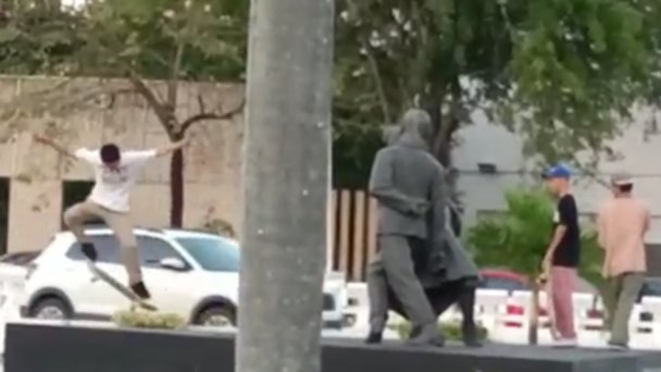 Tres menores de edad fueron captados en el momento que usaban la base del monumento denominado “El Zapateado” en Villahermosa, como una pista de patinetas.