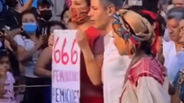 El momento fue grabado en video y se ha viralizado en redes sociales; en él se ve a una mujer vestida de tehuana portando un cartel con la frase en diversos colores “Oaxaca lo tiene todo”, y se acerca al mandatario para tomarse una foto.
