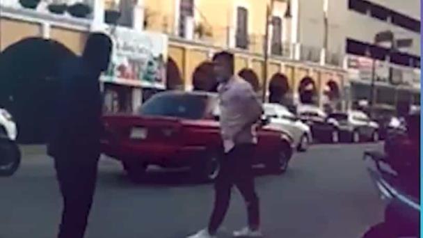 En los hechos que ocurrieron en la calle Francisco I. Madero, se observa como el joven reta al acomodador de vehículos, mientras este último trata de tranquilizarlo y evitar la confrontación.