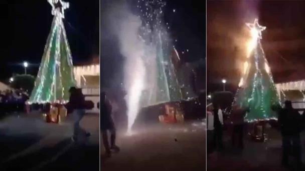 A través de un video se observa cómo varias personas se encuentran alrededor del pino ubicado en la plaza principal y luego de que los juegos pirotécnicos se prendieran, el árbol comienza a arder de diversos puntos. Tanto asistentes como encargados del evento intentaron sofocar las llamas pero su esfuerzo fue en vano.