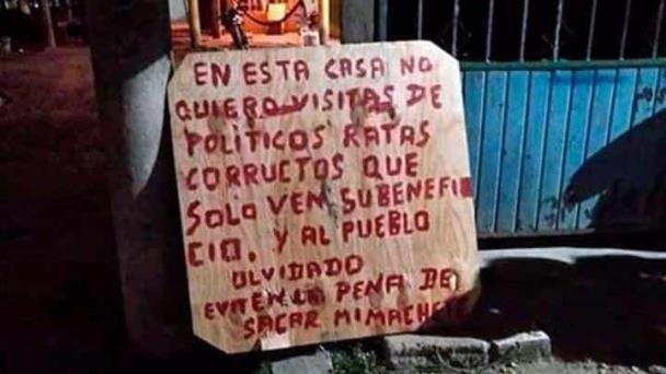 En una tabla que mantiene a las afueras de su casa como un estandarte escribió: “en esta casa no quiero visitas de políticos ratas, corruptos que solo ven su beneficio y al pueblo olvidado. Eviten la pena de sacar mi machete”, advierte.