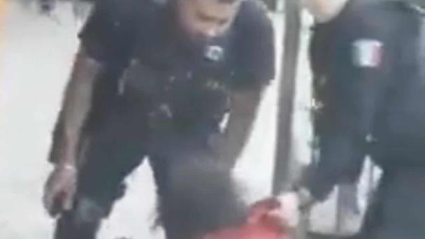 En la grabación que fue difundida en redes sociales, se observa cuando una pareja de agentes parece interrogar a un hombre sentado en el piso, cuando uno de los oficiales le da una patada en el rostro, mientras que su compañera se sube con todo su peso sobre una de sus piernas.