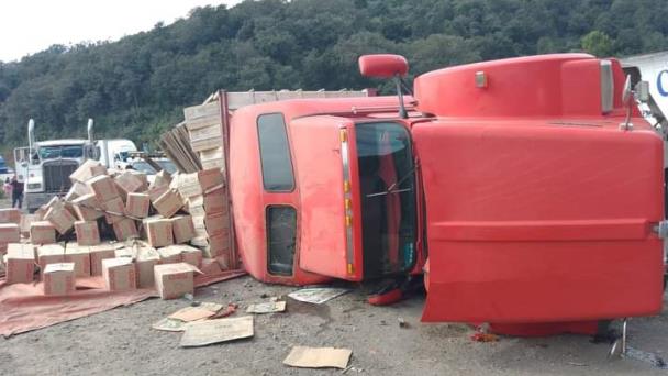 Un tráiler cargado con cajas de huevos volcó este jueves en la autopista 150D Puebla-Orizaba, cuando el conductor intentaba ingresar a una rampa de emergencia tras quedarse sin frenos.