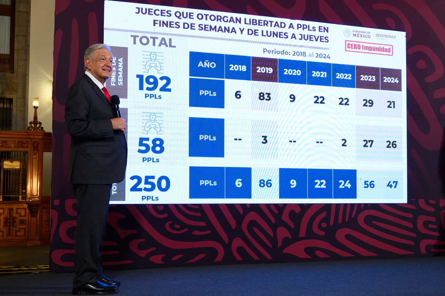 Como una prueba de la corrupción que impera en el Poder Judicial, volvió a exhibir la gráfica donde se menciona que, de 2018 a 2024, diversos jueces han otorgado libertad a 250 presuntos delincuentes, de los cuales, 192 han sido liberados los fines de semana.